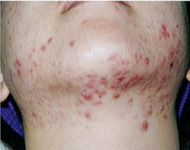 | 赤ニキビ 炎症を起こすと、面皰はやがて紅色丘疹になります。炎症をお越し、触れると痛みを感じるものが赤ニキビです。 |