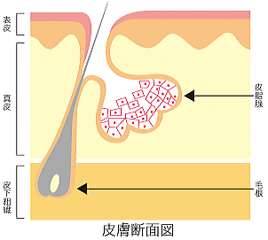 ニキビは皮脂分泌の異常であり皮膚疾患の1つでもあります。その学術的な名称を尋常性ざ瘡といいます。毛穴の出口が詰まり、皮脂が毛包内に溜まり毛包が拡大して袋状になります。もともと毛包の奥には細菌が住んでいて、その細菌が皮脂を栄養源として繁殖し、炎症を起こします。