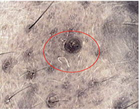 黒ニキビ 毛包内に貯留している皮脂が毛口を押し広げることによって、毛口が開放されて、空気中の汚れの付着や皮脂の酸化がみられるようになると、毛口の部分が黒っぽくなります。これが黒ニキビです。 |