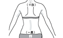 背中の中心上で、首の後ろ(うなじ付近)に白側(+極)、腰の下(骨盤の中央付近)に黒側(ー極)のパットを貼る(脊髄通電)