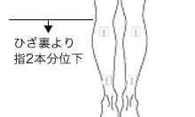 ひざ裏より指2本分位下の位置と、ふくらはぎに貼る